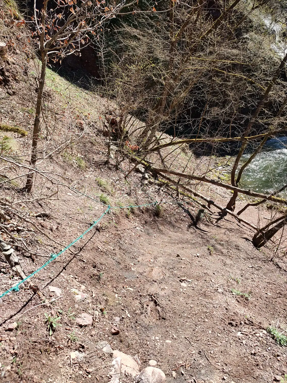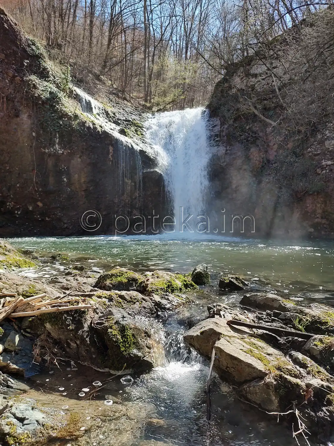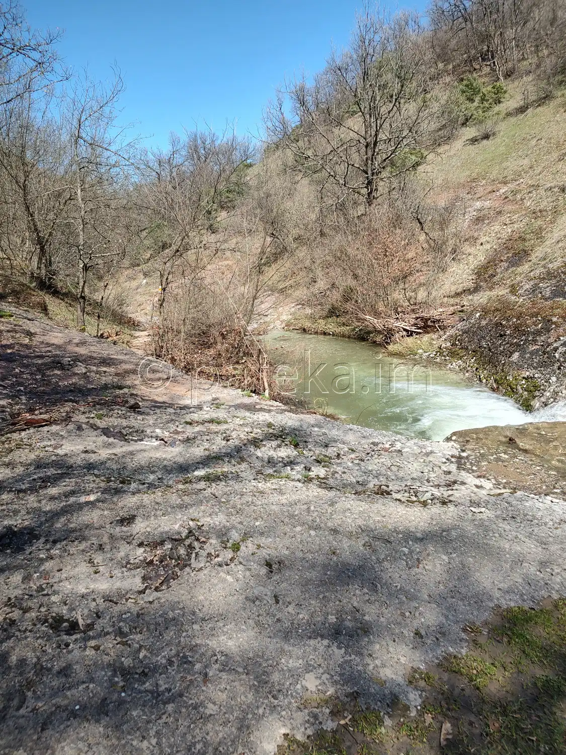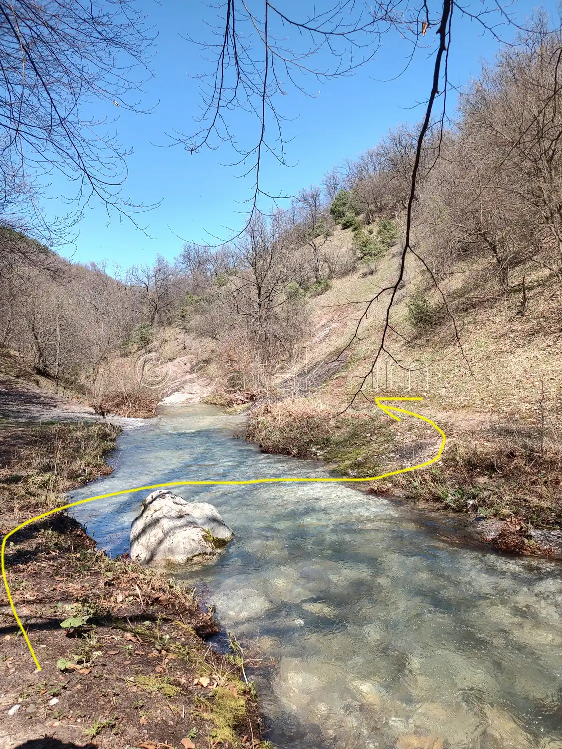 За да продължите към водопада, трябва да прегазите реката. При по-високи води, най-подходящият участък се намира горе-долу по средата между мястото, където слиза пътеката до реката, и първия праг надолу по реката. Там речното корито е сравнително равно и не много дълбоко. За ориентир може да послужи и един голям камък във водата – мястото е непосредствено под него. Преценявайте на място къде е най-подходящо и преминавайте с повишено внимание при високи води и силно речно течение. Можете да се ориентирате и по започващата на отсрещния бряг вече отъпкана пътечка.
