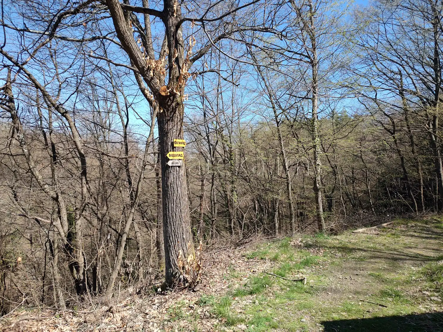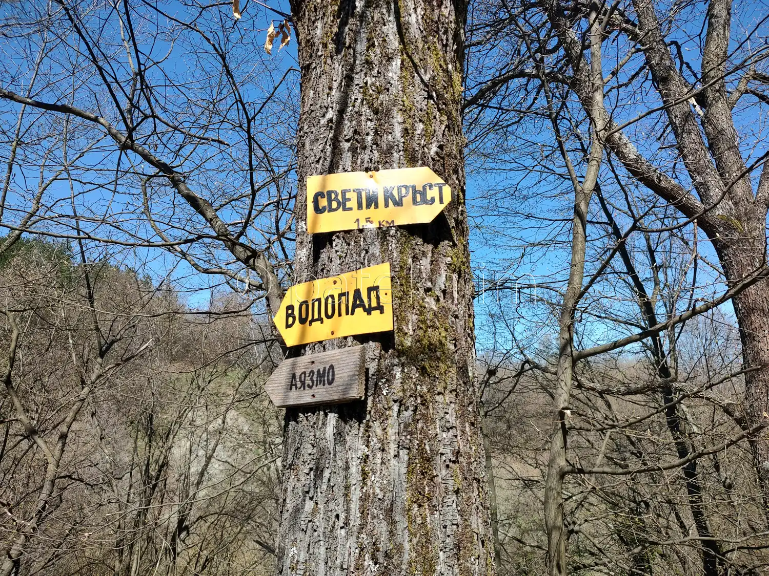 Пътеката завива наляво и слиза към реката. На мястото има указателни табелки, сочещи, че вляво се намират водопадът и аязмото, а ако се поеме вдясно, може да се стигне до кръста. Големият бял кръст се вижда, ако погледнете назад от паркинга – поставен е през 2020г. в местността Св. Троица над селото.