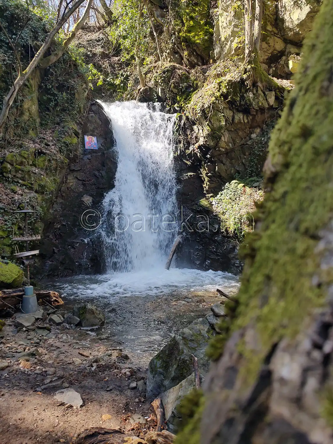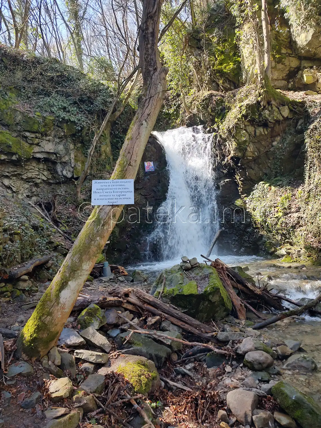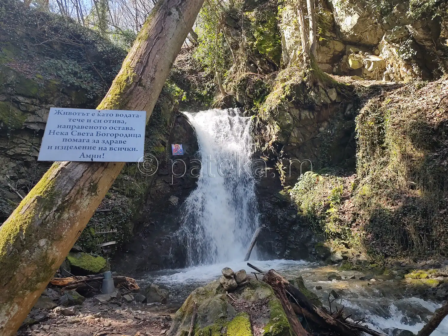 До водопад Св. Богородица остава по-малко от минута. Долу, покрай реката, вдясно се вижда аязмото.